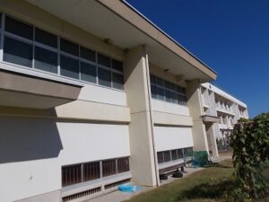 【現地確認/現地調査】 昭和49年建設の屋内運動場です。 今回の設計は、屋根、外壁及び渡り廊下を含む大規模改修となります。 外壁劣化調査等を行い図面作成着手です。